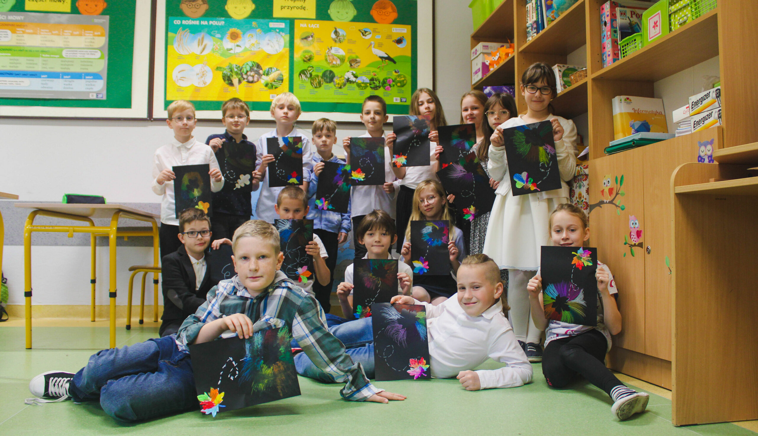 Tutaj 3B, serwus! Mówią, że czerń jest smutna, co nie? Uznaliśmy, że trzeba wypełnić czymś czerń czerni, dlatego też wzięliśmy pastele do rąk i zabraliśmy się do pracy. I …