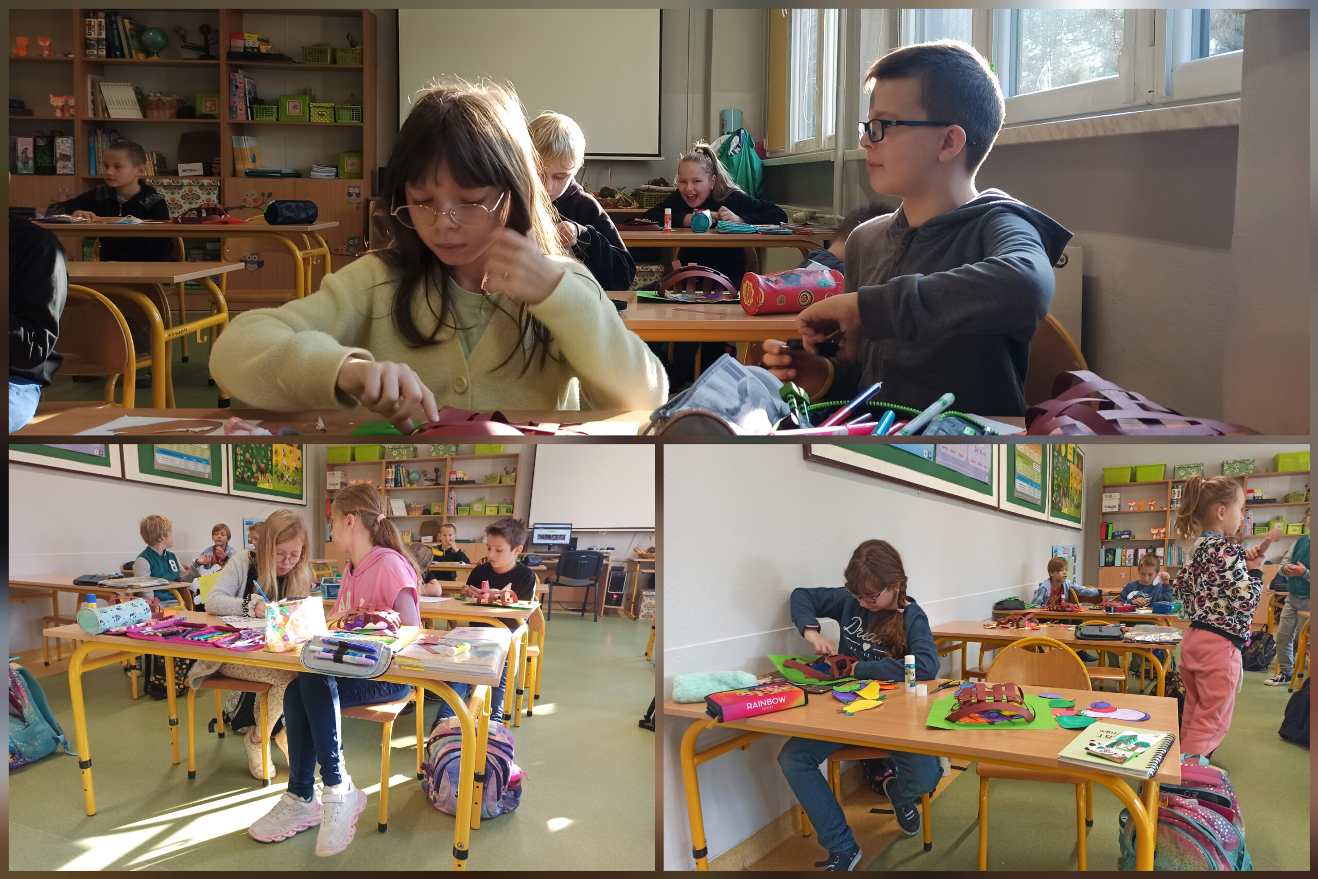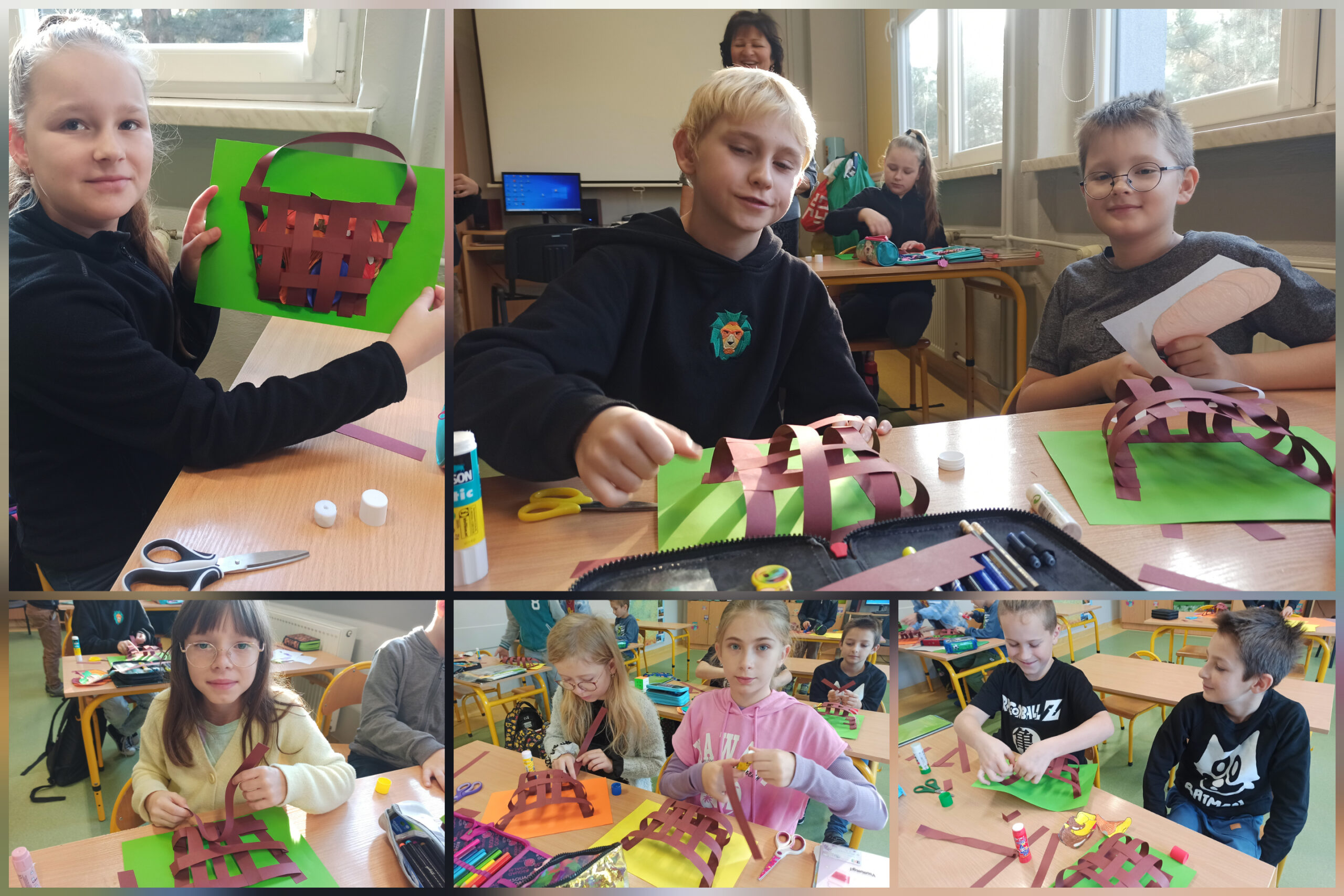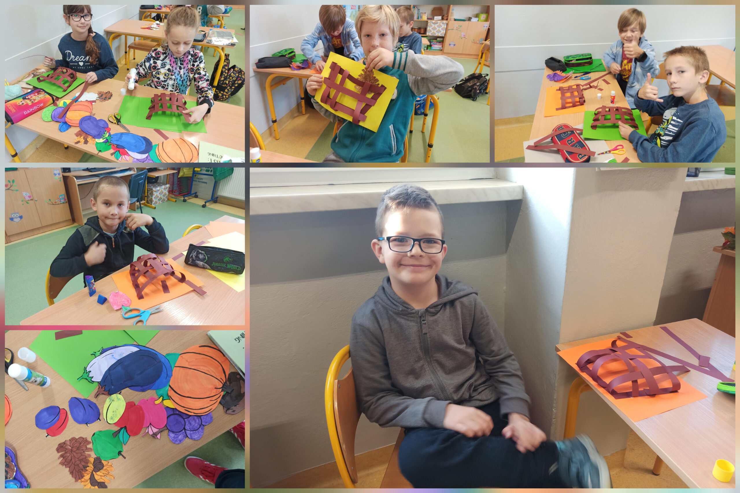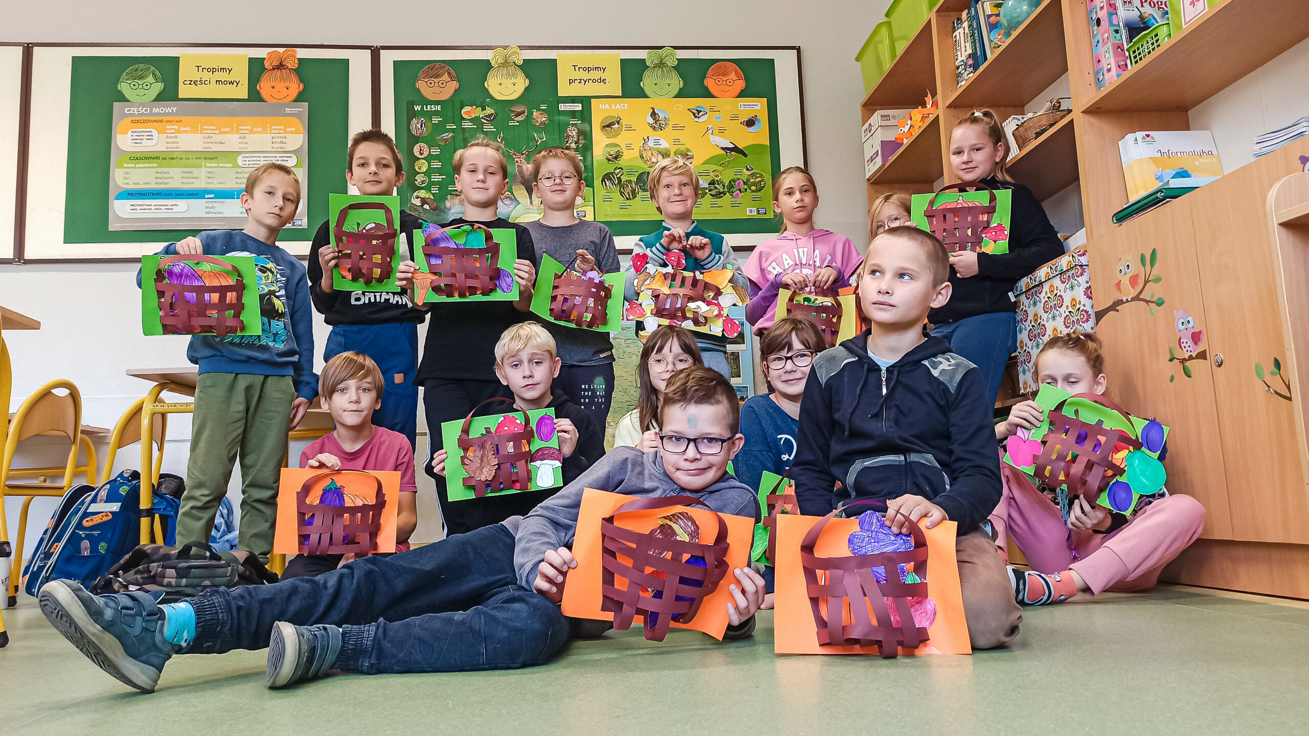 Tutaj 3B! Skoro jesień już w rozkwicie, postanowiliśmy stworzyć kompozycje z jej owoców. Póki co, jedynie z papieru, ale od czego ma się wyobraźnię, prawda? Na te prawdziwe przyjdzie jeszcze czas! A w czym najlepiej umieścić taką kompozycję? Oczywiście, że w koszu! Jako że lubimy wyzwania, wypletliśmy własne koszyki. Nie spodziewaliśmy się, że to takie proste! Jedni umieścili w nich warzywa, inni owoce, jeszcze kolejni postanowili zostać grzybiarzami, a część stworzyła prawdziwy miszmasz. Może następnym razem zrobimy coś z wikliny?