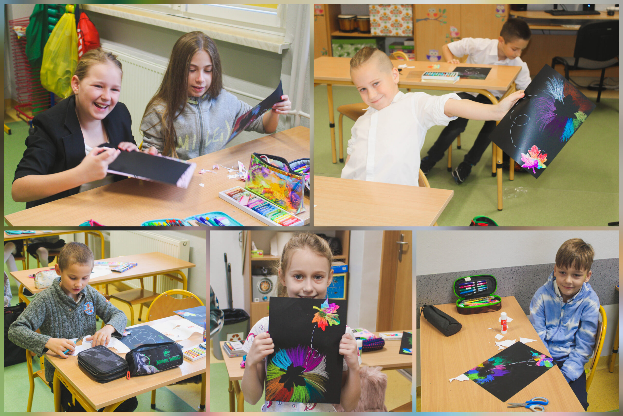 Mówią, że czerń jest smutna, co nie? Uznaliśmy, że trzeba wypełnić czymś czerń czerni, dlatego też wzięliśmy pastele do rąk i zabraliśmy się do pracy. I w ten właśnie sposób powstała seria obrazów „Rozbłysk jesieni”. Niby mrocznie, ale jednak przy okazji tęczowo i jesiennie. Pastele są spoko! Czerń i jesień też.