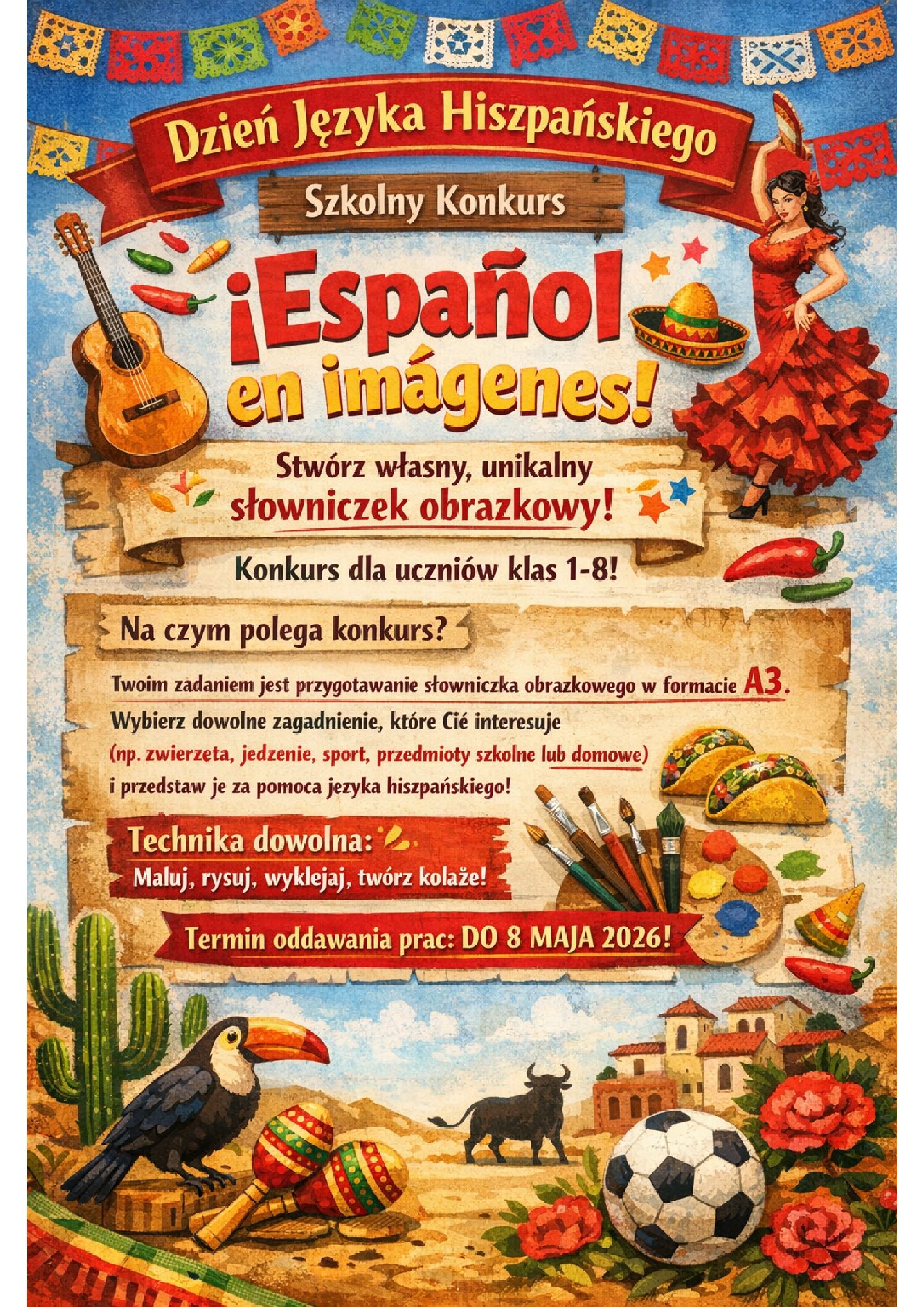 Zapraszamy do udziału w szkolnym konkursie „Español en imagenes” z okazji Dnia Języka Hiszpańskiego. Stwórz własny, unikalny słowniczek obrazkowy! Konkurs organizowany jest dla uczniów klas 1-8. Na czym polega konkurs? Twoim zadaniem jest przygotowanie słowniczka obrazkowego w formacie A3. Wybierz dowolne zagadnienie, które Cię interesuje (np. zwierzęta, jedzenie, sport, przedmioty szkolne lub domowe) i przedstaw je za pomocą języka hiszpańskiego. Technika wykonania jest całkowicie dowolna- możesz malować, rysować, wyklejać, a nawet stworzyć kolaż! Termin oddawania prac: do 8 maja 2026.